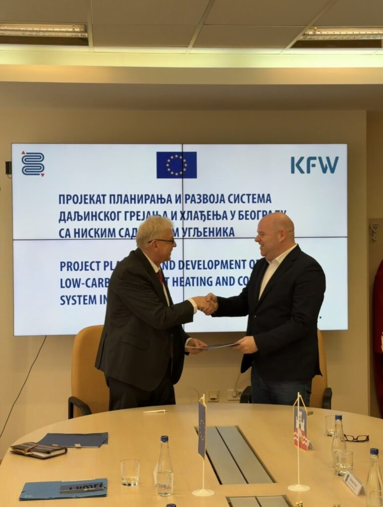 Vanja Vukić, direktor JKP „Beogradske elektrane“, i Carsten Sandhop, direktor kancelarije Nemačke razvojne banke u Beogradu, danas su potpisali ugovor o donaciji 500.000 evra za unapređenje sistema daljinskog grejanja i hlađenja u Beogradu. Projekat se realizuje uz podršku Evropske unije u okviru programa EFSD+, sa ciljem da se unaprede strateško planiranje, energetska efikasnost i održivost gradskog sistema daljinskog grejanja.